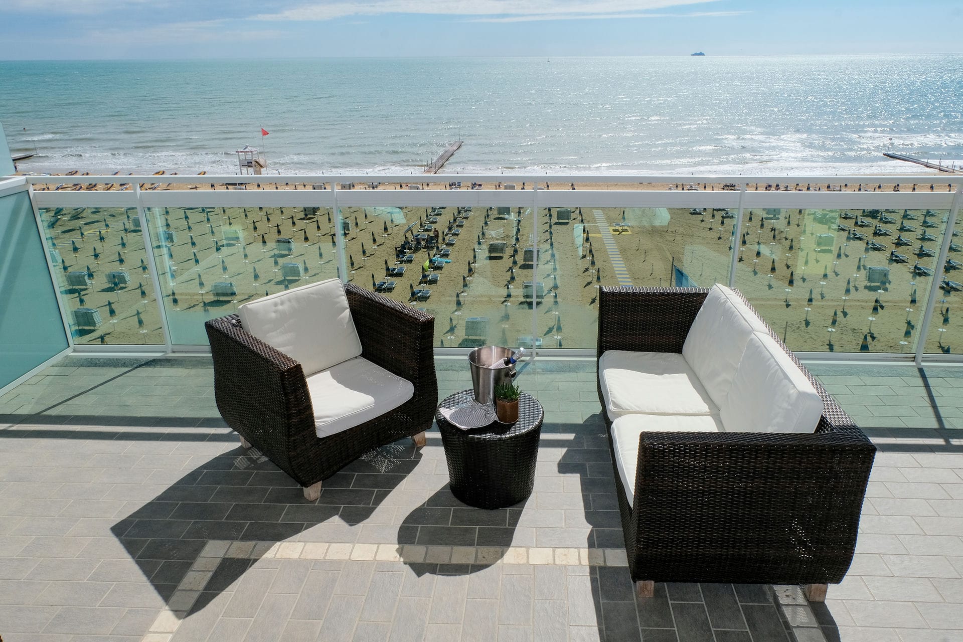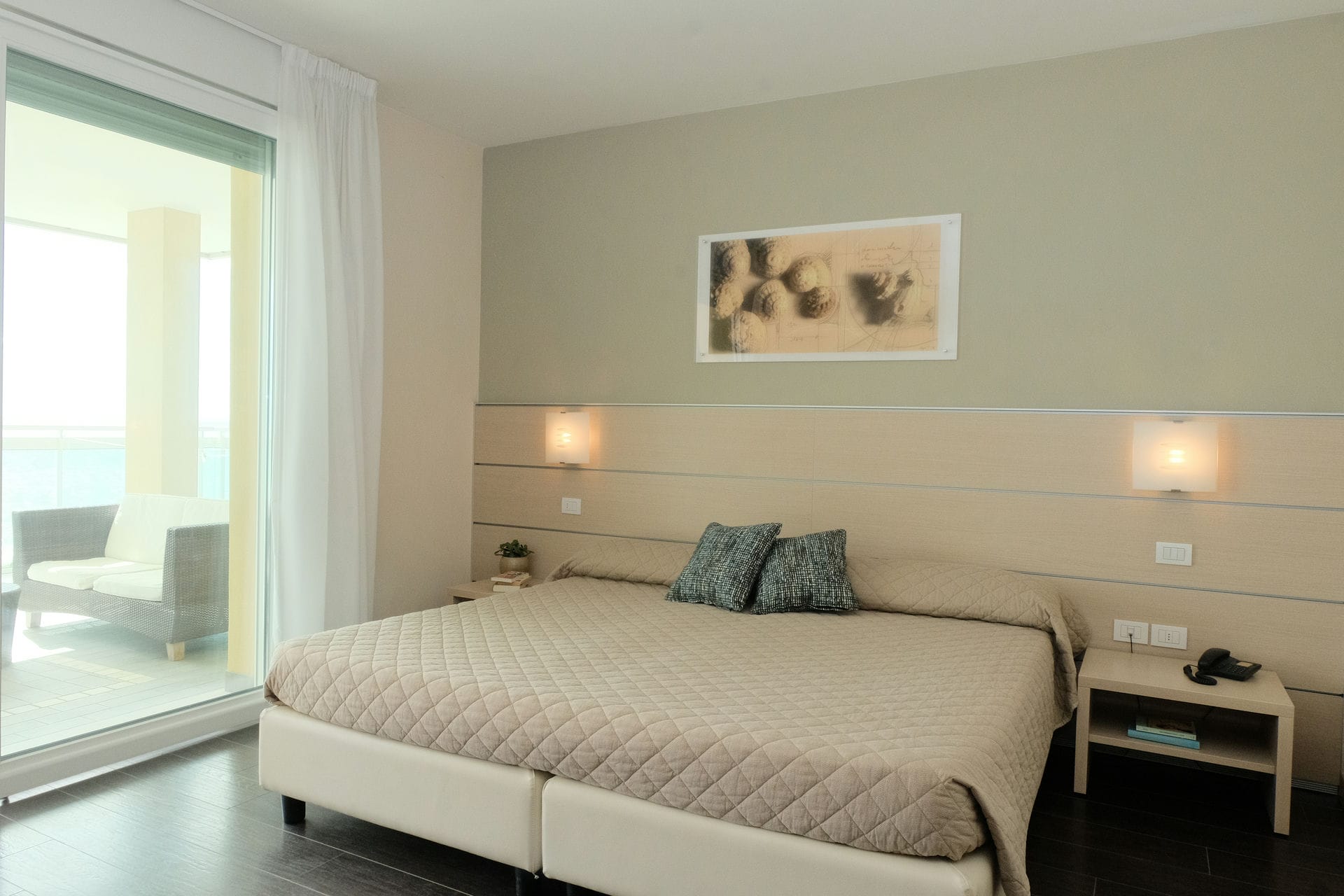 Das Superior Plus Zimmer (ca. 22/27 m²), das sich auf der obersten Etage des Hotels befindet, ist unser prestigeträchtigstes, geräumigstes und aufregendstes Angebot, ideal für alle, die Ruhe und Entspannung lieben. Es verfügt über eine sehr große 16 m² Terrasse mit frontalem Meerblick oder Stadt-/teilweisem Meerblick, die mit einer gemütlichen Lounge im Freien ausgestattet ist. Es wurde kürzlich renoviert und verfügt über ein Doppelbett, das aus zwei Einzelbetten besteht, und ein Sofa, das in ein bequemes Etagenbett umgewandelt werden kann. Das große, moderne und voll ausgestattete Badezimmer verfügt über Duschkabine und Haartrockner. Das Zimmer verfügt außerdem über unabhängige Klimaanlage, Safe, LCD-Fernseher, Telefon und Wi-Fi-Anschluss.